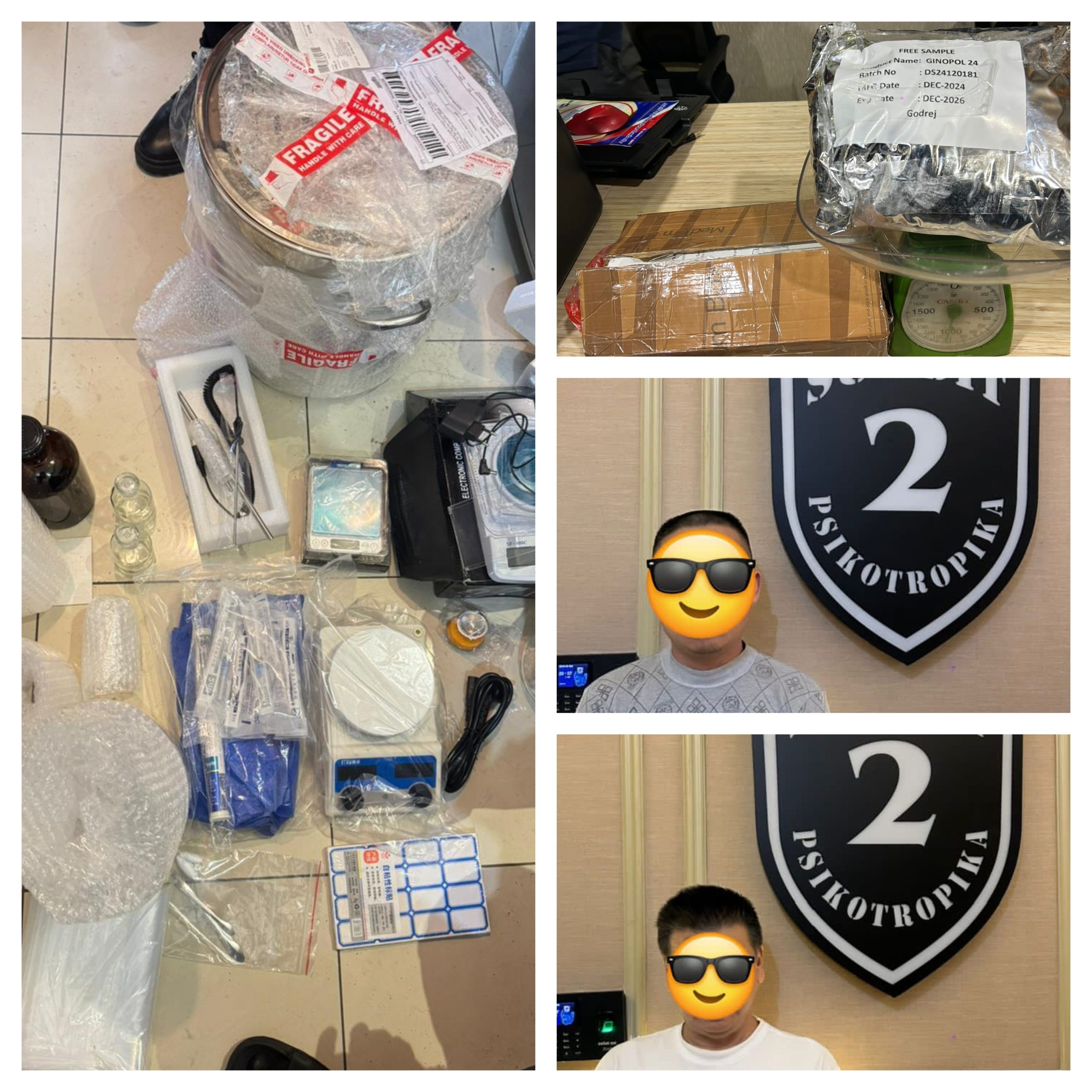 “Dari penggeledahan unit apartemen tersangka, polisi menemukan satu paket narkotika jenis etomidate seberat bruto 100 gram serta berbagai peralatan yang diduga digunakan untuk kegiatan produksi narkotika.